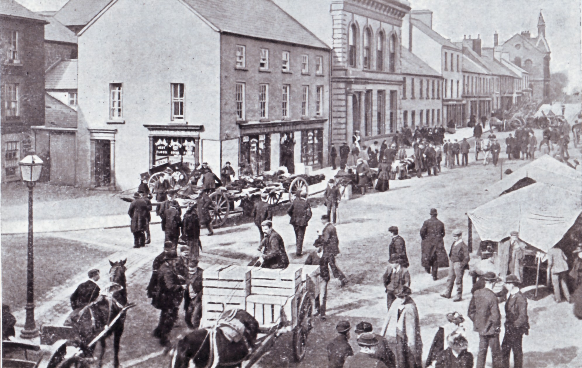 Every Thursday, the general market sold a wide variety of goods e.g. grain, oatmeal, fish, potatoes, turf, pig carcasses, butter, crockery and earthenware. The cattle market was held on the first and third Thursday of the month, and the grain market was held every Monday, Wednesday, and Friday.